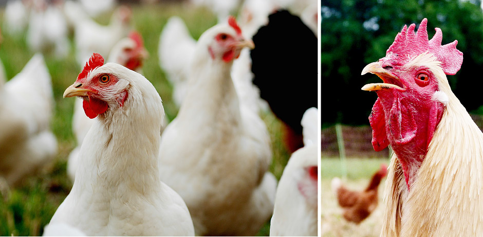Die Hühner wandern in vier Mobilställen über die Gras- und Kleegrasflächen des Betriebes und finden einen Teil ihres Futters an immer neuen Stellen.