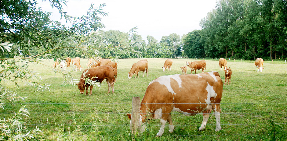 Die Kühe grasen auf den weiten Naturschutzflächen der Kendelniederung und leben im Winter im hellen Offenfrontstall.