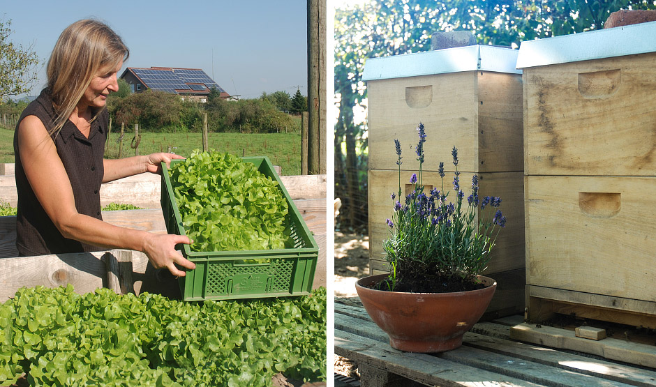 Auf den Feldern werden Kartoffeln, Kürbisse, Möhren, Erbsen und Bohnen angebaut. Darüberhinaus Getreide, Mais und Kleegras als Futter für die Tiere. Auf der Streuobstwiese wachsen alte Apfelsorten wie Gravensteiner, Klarapfel, Winterrambur, Renette und Jonathan.