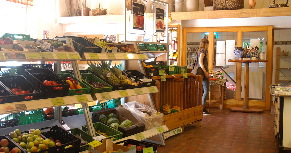 Eine große Auswahl an Bio-Produkten wird auf einer Verkaufsfläche von 120 qm im Hofladen angeboten. Frischfleisch, Wurstwaren und Aufschnitt sowie ein breit gefächertes Gemüseangebot, aber auch die Kartoffeln stammen aus eigener Erzeugung, Eier von den eigenen Hühnern. Daneben gibt es ein komplettes Naturkostwaren-Sortiment.
