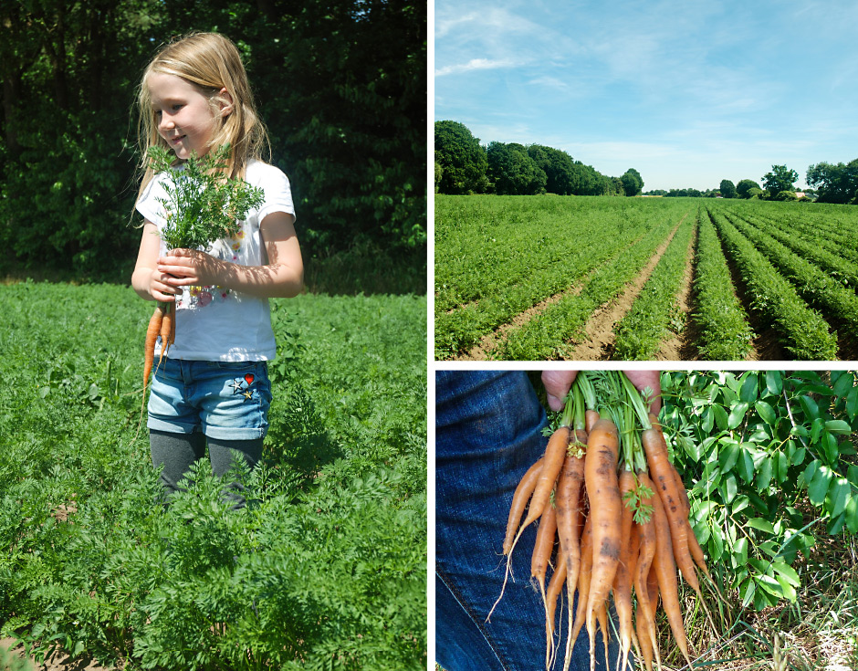 Zwiebeln, Möhren, Kartoffeln, Blumenkohl und Schnittlauch werden angebaut - zudem Mais und Weizen als Futterpflanzen für die 1000 Hühner (Elterntiere mit ihren Küken, sowie Masthähnchen).