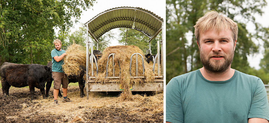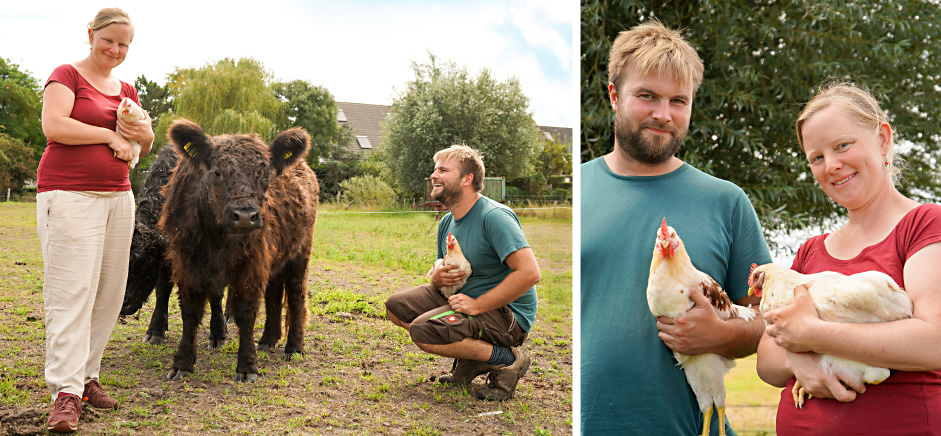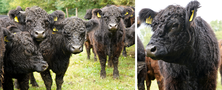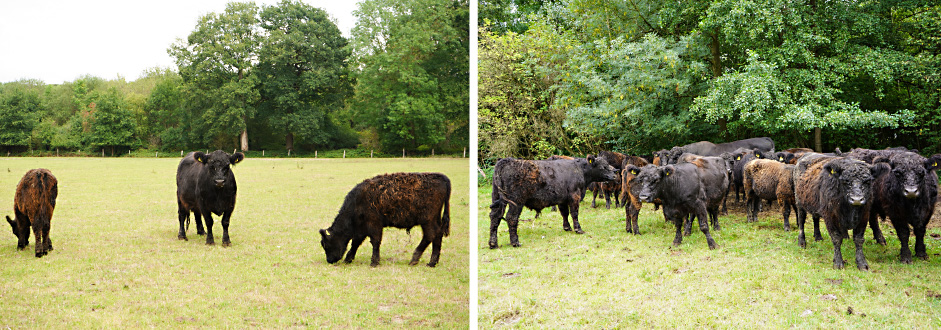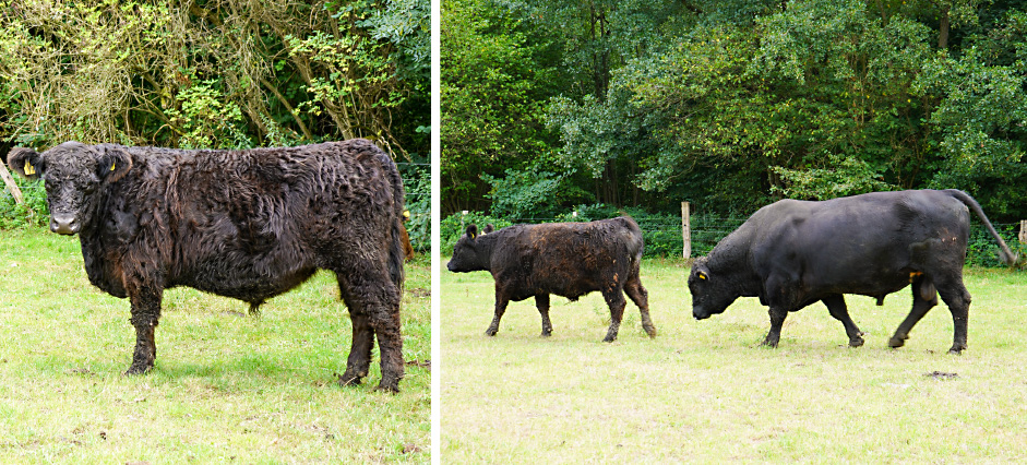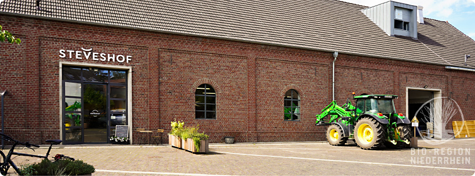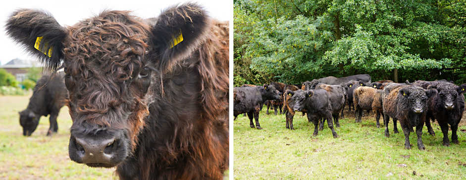 Der Steveshof ist seit Generationen in Familienbesitz, seit 2016 arbeiten Stephie und Finn Bönniger hier nach Bioland-Richtlinien. Ihre 70 Galloway-Rinder - davon 20 Mutterkühe mit Nachzucht - weiden ganzjährig auf den Naturschutzflächen des Hülser Bruchs. Die robusten, langsam wachsenden und eher kleinen Tiere betätigen sich auf den extensiv bewirtschafteten, nährstoffarmen Flächen auch als Landschaftspfleger, denn sie halten die Wiesen von Verbuschung frei. In den Wintermonaten, wenn kein Grün mehr wächst, wird die Grasernte des Sommers an die Rinder verfüttert.
